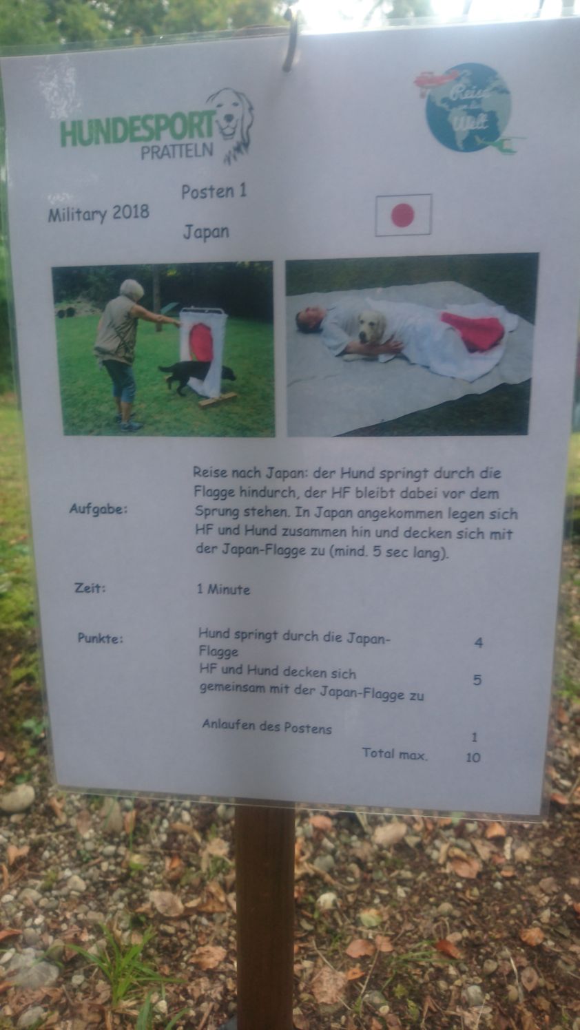 Und weiter ging es nach China. Wir dachten schon, wir müssen die Chinesische Mauer überwinden, so lange mussten wir hier warten. Nachdem wir beinahe eine halbe Stunde im Regen standen, vergass ich dann, das Aufgabenblatt zu fotografieren. Es standen 3 Hocker auf dem Boden mit jeweils einem kleinen Schälchen darauf und einer Fussmatte daneben. Im ersten Schälchen lagen drei Hundekekse, welche man mit chinesischen Essstäbchen ins nächste Schälchen transportieren musste und von dort ins dritte. Der Hund sollte in der Zwischenzeit auf den Fussmatten einmal liegen, einmal sitzen und einmal stehen.