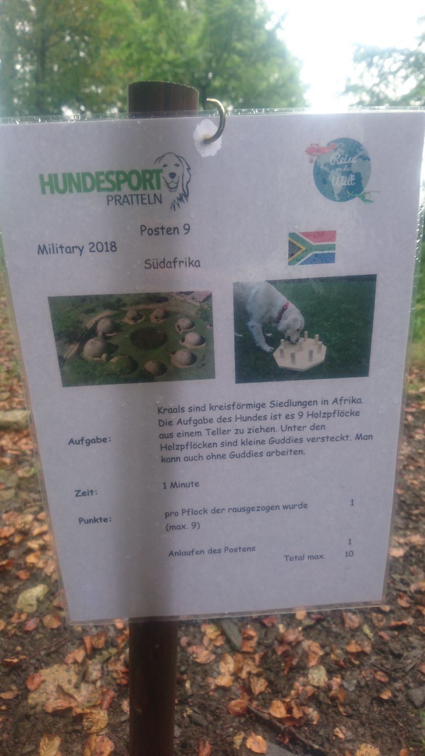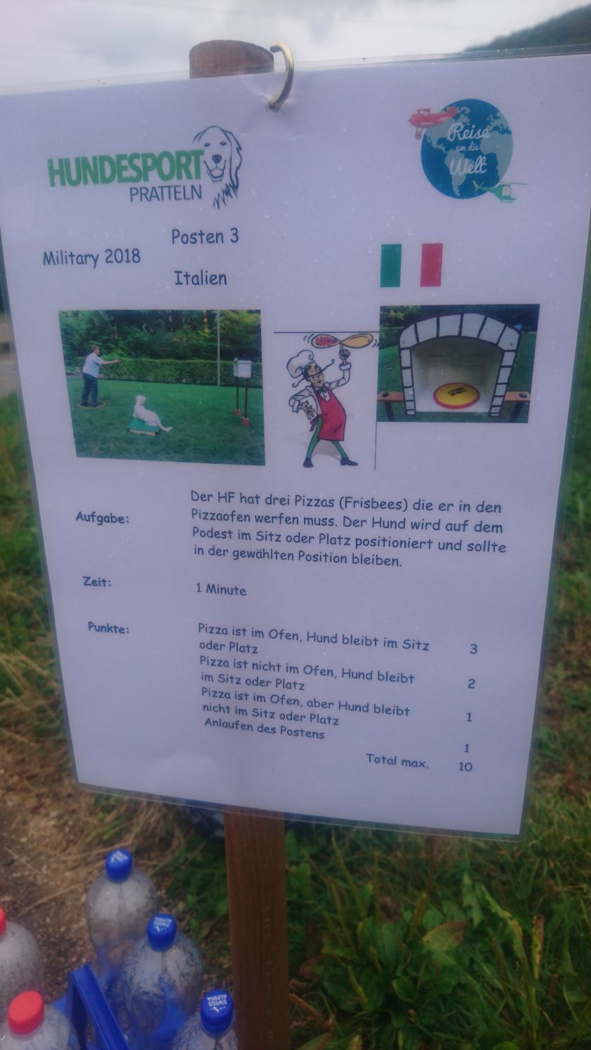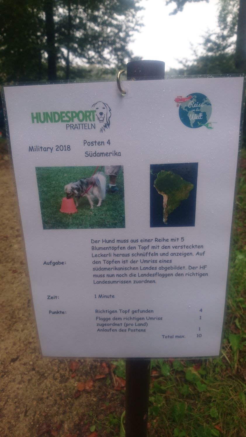 Und dann ging es weiter zum Koffer packen. Ein typischer Apportierposten, wobei auch hier die Anweisungen wieder etwas schwammig waren. So durfte der Hund die Gegenstände auch neben den Koffer legen… Ab welcher Distanz zum Koffer es dann keine Punkte mehr gibt, war uns nicht ganz ersichtlich. Ausserdem war ich froh, habe ich einen einigermassen grossen Hund, da die zu apportierenden Gegenstände alle ziemlich gross waren und vom Regen schon total vollgesogen und entsprechend schwer. Trotz allem ein guter Posten, mit etwas Verbesserungspotential bei der Planung.